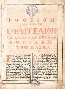 The manuscript of the Konikovo Gospel is the oldest known Bible translation into modern Macedonian vernacular. It is a Greek vernacular-based evangeliarium with a translation to the Macedonian vernacular of Lower Vardar, from the eve of the 19th century. The manuscript, written by an anonymous translator who used Greek script for both the Greek and the Macedonian text, was discovered in 2003 in the library of the Greek Orthodox Patriarchate of Alexandria.[5]