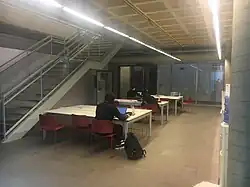 The library has a quadrangular format and is composed by two floors with panoramic windows, with sights for the center of the building. In the interior of the ground floor are two walls with information on the life of José Mindlin and on the library. The information are presented in timeline. In addition, there are walls that bring more information on the collection, the works, or the authors of the works.[12] In the architectural project of the building, a bioclimatic concept was applied to protect and keep preserved diverse rare works.[13]