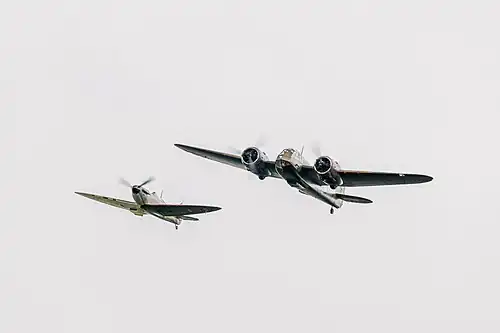 The airfield is now operated by The Bicester Aerodrome Company,[56] a part of the Bicester Motion Ltd. group as an unlicensed airfield. Private operators such as Finest Hour Experiences[57] and Motor Glide offer flight training and experience flights from the airfield in addition to privately owned powered aircraft and glider activity. Most recently the airfield was visited by the only flying Bristol Blenheim bomber for Flywheel,[58] an event run by Bicester Heritage to celebrate their 10 year anniversary.[59] Other period aircraft such as a MK1 Spitfire also visited for the event.[60] Returning a Bristol Blenheim to the grass airfield of the former RAF Bicester was a remarkable nod to the location's WW2 history, as a representative of the Aircraft Restoration Company, who maintain the Blenheim at Duxford said: