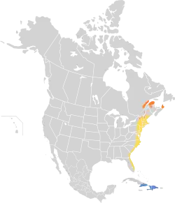 Bicknell's thrush scattered breeding range extends from southeastern Quebec to Nova Scotia in Canada and the sky islands of northern New England and the Adirondacks and Catskills in New York. It is the rarest and most secretive of the breeding thrushes in North America, and it is the only bird species whose breeding range is entirely restricted to the northeastern part of the continent. It is a habitat specialist in its breeding range. It is known to favor high altitude coniferous forests affected by strong winds and heavy ice conditions. They usually breed at higher elevations, normally nesting above 915 m (3,002 ft).[9] However, they do not only live in this habitat, they also inhabit successional forests that have recently been affected by the forest industry.[7] Its habitat is therefore best characterized by highly disturbed forest, where trees are small and stunted.