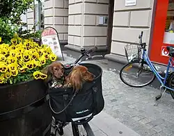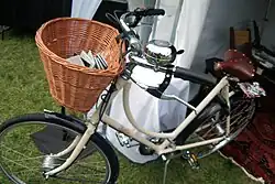 A bicycle basket is a bicycle-mounted basket for carrying cargo, usually light cargo. They are usually used for light shopping duties such as going on daily visits to the shops for fresh bread or milk. Baskets are often mounted on the handlebars and made of traditional basket weaving materials such as wicker and cane or even woven plastic that merely looks like wicker or cane. They can also be made of other materials such as metal mesh. Euroboxes (for example 40×30×25 cm) or milk crates[1] are also used as bicycle baskets.