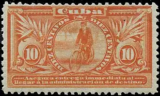 The depiction of bicycles on stamps began in 1899 with a Cuban special delivery stamp, although unofficial (local or cinderella) issues had been previously released in Germany (1887/8), in the United States (1894),[1] and in Australia (1896).[2] The number of bicycle-related postal items (stamps, postal stationery, etc.) exceeds 30,000 as of 2024.[3] As a thematic topic, bicycles are notable for the wide variety of subjects that they are used to illustrate.[4]