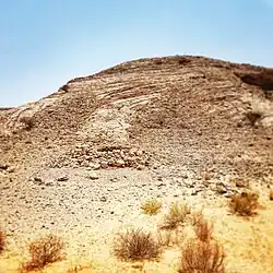 ![]() A panoramic view of the Eastern slopes of Bidaa Bint Saud, showing Hafit period beehive tombs. The Iron Age building is at the top of the tell. | |