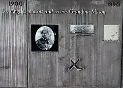 After becoming free, Mason and her daughters moved in with Robert Owens, the father of Charles Owens and a well-known Los Angeles businessman.[8] Her daughter Ellen would eventually marry Charles Owens.[6] Mason worked in Los Angeles as a nurse and midwife, delivering hundreds of babies during her career. Using her knowledge of herbal remedies, she risked her life to care for those affected by the smallpox epidemic in Los Angeles.[6] One of her employers was the noted physician John Strother Griffin.[21] Saving carefully, she was one of the first African American women to own land in Los Angeles.[6] As a businesswoman, she amassed a relatively large fortune, which she shared generously with charities. Mason also fed and sheltered the poor and visited prisoners.[6] She was instrumental in founding a traveler's aid center, and a school and day care center for black children, open to any child who had nowhere else to go.[22][23] Because of her kind and giving spirit, many called her "Auntie Mason" or "Grandma Mason".[6]
