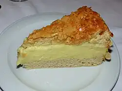 Bienenstich (German pronunciation: [ˈbiːnənˌʃtɪç] ⓘ) or bee sting cake is a German dessert cake made of a sweet yeast dough with a baked-on topping of caramelized almonds and filled with vanilla custard, buttercream, or cream.[1][2] The earliest German and Swiss recipes for the cake date to the beginning of the 20th century. The dairy cream and custard filling would have required cool storage, inaccessible to most households in earlier centuries.
