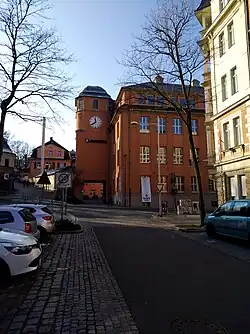 In 1913, the second part of the business was opened with the Hafenmühle in Dresden's Friedrichstadt.[54] The Bienerts then built a modern industrial bakery in Plauen on the site of the former "Hegersche Gut" estate east of the railroad tracks. Some of the old mill buildings as well as the residential buildings Altplauen No. 11-15, which also belonged to the former Hegersche Gut, had to be demolished for the construction. The striking building with the clock tower was built between 1913 and 1918 in reinforced concrete at the entrance to Schleiermacherstraße. It housed several baking ovens, bread rooms, and warehouses and sheds for the company's fleet of vehicles. The architect was Carl Schümichen, and the construction was carried out by the Plauen-based company Gebrüder Fichtner and the concrete construction company Dyckerhoff & Widmann.[65]