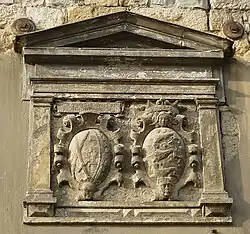 The electoral coat of arms in the courtyard is a reminder of this old court mill. The relief stone, one of the oldest individual monuments in Dresden, shows the electoral swords with the Saxon rhombus on the left and three lions under a crown on the right. The latter are taken from the Danish imperial coat of arms and refer to Electress Anne, Augustus' wife, who was instrumental in the economic development of Saxony as a promoter of agriculture. Between the coats of arms are two intertwined monograms with the letter A, both of which commemorate the mill's patron.[13] However, since the Bienertmühle was renovated after 2011, they are almost unrecognizable.