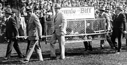 In 1923, after seeing the University of Wisconsin football team carry live badgers at games, University of Michigan athletic director and football coach Fielding H. Yost decided to procure a wolverine.[1] Despite writing letters to 68 trappers, Yost was reportedly unable to find a wolverine. The best he could do in 1924 was to obtain a mounted and stuffed wolverine from the Hudson's Bay Company.[1][2] The stuffed wolverine was named “Biff” and was featured on the cover of a 1925 game program, along with team captain Robert J. Brown straining to hold Biff on a leash. The caption to the photograph read: “Capt. Bob Brown and Biff: The Wolverine Mascot of Michigan Athletic Teams Is Noted for Its Ferocity and Gameness in Battle, a Characteristic of Every Team that Wears the Maize and Blue.”[3]