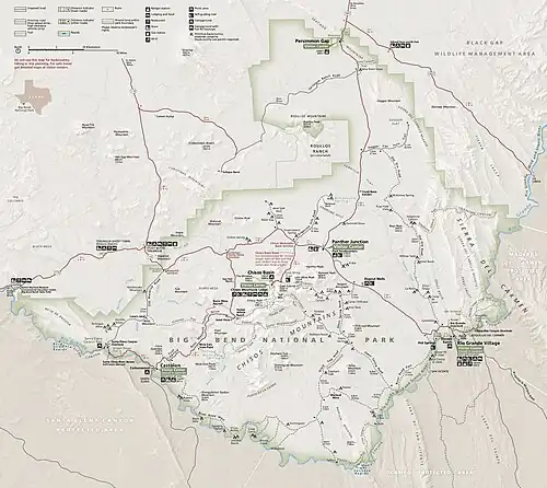 45. ^ "Brewster County". Texas Education Agency. March 7, 2001. Archived from the original on March 7, 2001. Retrieved June 16, 2021. - The map shows the park outline.