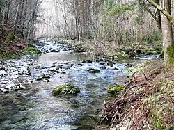 The source of Big Božna Creek is in the Polhov Gradec Hills west of Ljubljana, not far from Kremenik.[5] It forms part of the watershed of the Ljubljanica River. The road from Polhov Gradec to Črni Vrh runs through the Big Božna Valley.[6] The Big Božna is joined by Little Božna Creek (Mala Božna, recorded in German as the Botschnia or Botschnia bach in the 18th century[7]) about 2 km north-northwest of Polhov Gradec, and then by Little Creek (Mala Voda) south of Polhov Gradec to form the Gradaščica River.