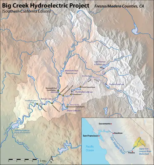 The Big Creek Hydroelectric Project is an extensive hydroelectric power scheme on the upper San Joaquin River system, in the Sierra Nevada of central California. The project is owned and operated by Southern California Edison (SCE).[1] The use and reuse of the waters of the San Joaquin River, its South Fork, and the namesake of the project, Big Creek – over a vertical drop of 6,200 ft (1,900 m) – have over the years inspired a nickname, "The Hardest Working Water in the World".[2]