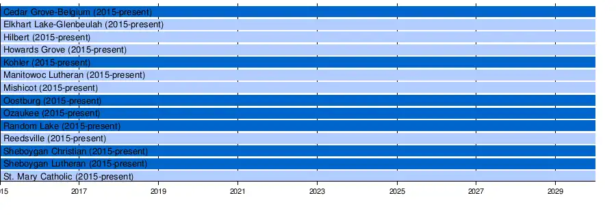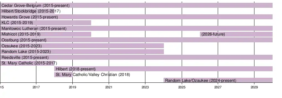 In February 2019, in conjunction with the Wisconsin Football Coaches Association , the WIAA released a sweeping football-only realignment for Wisconsin to commence with the 2020 football season and run on a two-year cycle.[ 2] The Big East Conference lost two of its ten football members to realignment: KLC to the Eastern Wisconsin Conference and Mishicot to the Packerland Conference .[ 3] The eight remaining schools (Cedar Grove-Belgium, Hilbert, Howards Grove, Manitowoc Lutheran, Oostburg, Ozaukee, Random Lake and Reedsville) continued on and maintained this alignment through the 2022-2023 realignment cycle.[ 4] In 2024, Ozaukee and Random Lake entered into a cooperative agreement to run a joint football program, leaving the Big East Conference with seven football-playing members.[ 5] That number will increase back to eight for the 2026-2027 cycle, with full members Mishicot rejoining from the Packerland Conference.[ 6]