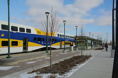 Big Lake station is a Northstar Line commuter rail station in Big Lake, Minnesota, located at 19691 County Road 43, in the southeast corner of Big Lake near U.S. Highway 10. The station features bicycle lockers and a park and ride lot with capacity for 518 vehicles. Commute time to downtown Minneapolis from this station is about 51 minutes.[3]