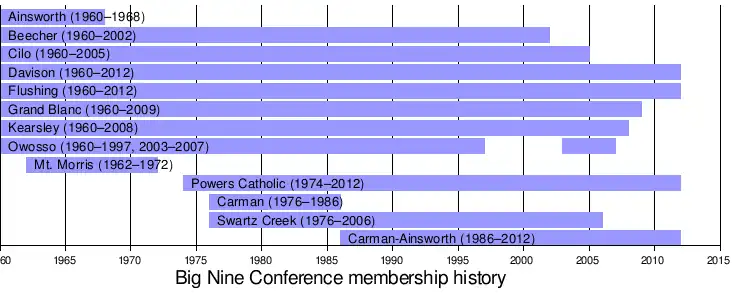 Formed in 1960 as the Big Eight Conference, the conference became the Big Nine Conference in 1962 with the addition of Mt. Morris High School. Ainsworth High School left in 1968, and Mt. Morris left in 1972. Powers Catholic High School joined in 1974. In 1976, Carman High School and Swartz Creek High School were added from the Flint Metro League, giving the conference its peak membership of 10.[1] Due to the collegiate Big Ten Conference, the conference's name remained the Big Nine Conference.