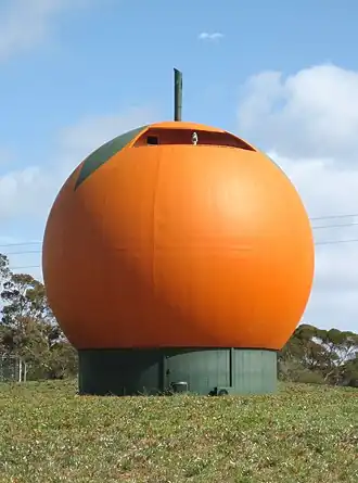 The Big Orange is one of a number of Big Things to be found in Australia and is located near the Riverland town of Berri in South Australia. Standing at 15 metres in height, with a diameter of 12 metres, it is the biggest of the "big fruit" in Australia, and formerly incorporated a cafe, souvenir shop, function room, lookout and a 360 degree mural within the structure. Opened in 1980, in its later years the landmark has struggled to find commercial success; after changing hands in 2002, 2006 and again in 2008, it has remained closed since 2004 and abandoned since 2012.[1] Nevertheless, it has been described as the "most defining icon of the region".[2]