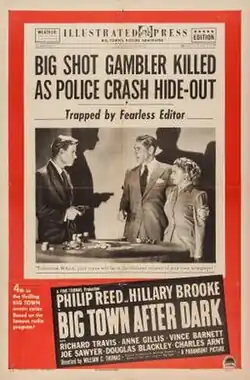Big Town After Dark is a 1947 American crime drama film directed by William C. Thomas and written by Whitman Chambers. The film stars Phillip Reed, Hillary Brooke, Richard Travis, Ann Gillis, Vince Barnett, Joe Sawyer and Robert Kent.[1][2] It was released on December 12, 1947, by Paramount Pictures.The film was the third in a series of four films based on the long-running radio program Big Town.