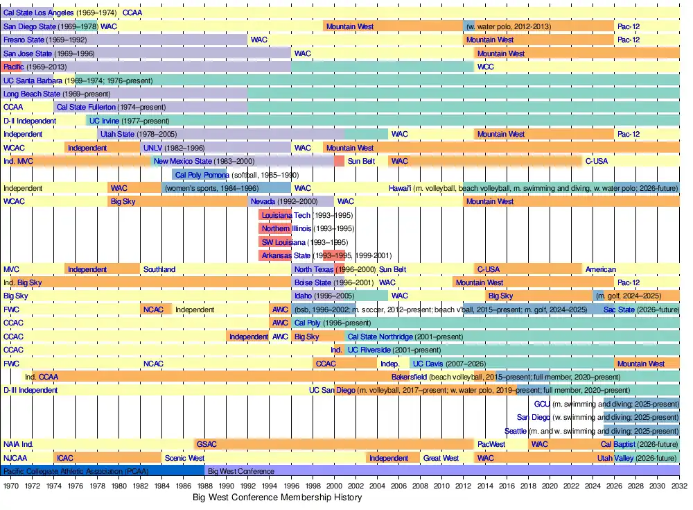 - ^ UC Davis will leave the Big West to join the Mountain West Conference as a full member in 2026, though they will remain an affiliate member for football in the Big Sky Conference.[15]