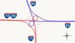 The Big X is located southeast of the Quad Cities metropolitan area, near Colona, Illinois. It is a simple cloverleaf interchange between north–south and east–west freeways. Traffic on both I-74 and I-80 must exit their respective highways in order to continue on their routes. On eastbound I-74 and westbound I-80, traffic takes a slip road to make a 90-degree turn. Westbound I-74 and eastbound I-80 traffic takes a cloverleaf ramp in order to make a 270-degree turn.