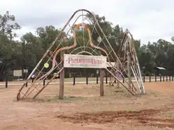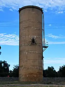 | The Big Spider | Urana | 2009 | The Big Spider (named "Not so Itsy" by the artist) was created by Andrew Whitehead, a nearby resident of the town. The spider commemorates the local football club, who were, for many years, known as the Spiders, and is built from a range of materials – including a wash tub and a hot dog muffler.[42][43] | ||