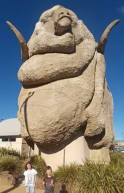 | The Big Merino | Goulburn | 1985 | 15×18 m (49×59 ft) | A sculpture of a merino ram, built in 1985.[25] Goulburn and The Big Merino were bypassed by the Hume Highway in 1992, leading to a reduction in visitor numbers. On 26 May 2007, Rambo (as the Merino is locally known) was relocated by low-loader to a new home within sight of the highway.[26] | ![]() |