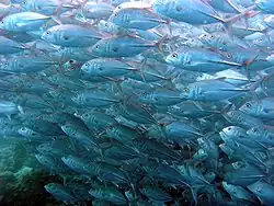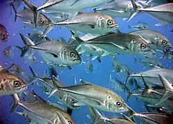 The bigeye trevally is a fast-swimming predatory species that has had several studies determine its diet in various places throughout its distribution. As mentioned above, the species is mostly inactive during the day, and feeds at dusk and through the night.[9] The large stationary aggregations break off as the fish move off to hunt in small groups or individually.[5] The species predominantly takes small fish as prey,[5][23] however supplements its diet with a varied array of invertebrates. These include crustaceans such as shrimps, decapods, copepods and stomatopods, cephalopods, gastropods, jellyfish, sponges and even species of open ocean sea-skater insects.[18][24] Bigeye trevally were found to be the primary fish predators of these sea-skates, and took far more of these than any other species of carangid. Evidence from South African estuaries indicates there is a shift in the species diet as it grows. Young fish below 200 mm in length take mostly the juveniles of other fish species but still have a significant intake of penaeid shrimps, while fish larger than this take small fish nearly exclusively.[18] The larger fish on reefs tend to move between these reefs regularly, which is thought to be due to prey availability.[21] Bigeye trevally are also an important prey for larger species, ranging from sharks and larger species of carangid[2] to sea lions and various birds.