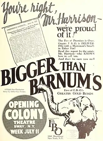 Bigger Than Barnum's is a 1926 American silent drama film directed by Ralph Ince and starring Ralph Lewis, George O'Hara, and Viola Dana.[1]