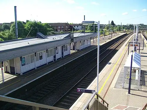Biggleswade railway station serves the market town of Biggleswade in Bedfordshire, England. It is on the East Coast Main Line, 41 miles 13 chains (41.16 miles, 66.24 km) from London King's Cross.[1] The station is managed by Great Northern, although most services are operated by Thameslink.