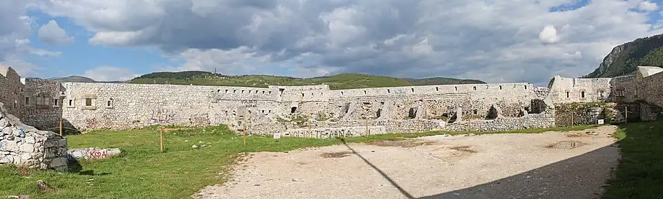 The White Fortress (Bosnian/Croatian/Serbian: Bijela Tabija, Бијела Табија) is an old fort overlooking the historic core of Sarajevo. It is a national monument of Bosnia and Herzegovina. Bijela Tabija is 667 metres (2,188 ft) above sea level.[1] Bijela Tabija is a protruding part of the wall of what was historically known as the old Vratnik City, and dominates the Eastern, the natural entrance to Sarajevo. It is built of stone and it used to house a gun-crew and an ammunition storage. Its thick walls have openings for cannons. [2] [3]