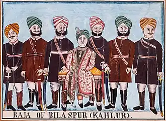 Raja Bhim Chand who succeeded Raja Deep Chand fought Battle of Nadaun against Mughals and came out victorious. Mughals under Alif Khan were supported by Raja of Kangra and Raja Dayal of Bijarwal[4] When Raja Bhim Chand abdicated in 1692 to lead a life of sanyasi the state was at previously unknown heights. The reign of Bhim Chand's son Ajmer Chand was of conquest as well. By the end of his forty years reign the number of states paying tribute was considerable: Baghal State, Baghat, Keonthal, Beja, Mangal, Bhajji, Mahlog, Dhami, Kuthar, Kotkhai, Kunihar, Balsan, and Nehra among others. All continued to pay tribute until Mahan Chand (1778) but by 1790 only Mangal State continued to acknowledge Bilaspur's suzerainty.[5] Since the 18th century the rulers of Bilaspur State patronised artists of the Kangra painting style.[6]