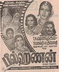 Bilhanan is a 1948 Indian Tamil-language historical drama film directed by K. V. Srinivasan, written by A. S. A. Sami and produced by T. K. Shanmugam of TKS Brothers. An adaptation of the play of the same name by Sami, itself based on the story of the Kashmiri poet Bilhana, Shanmugam also stars as the title character, along with T. K. Bhagavathi, M. S. Draupathi, T. K.Sivathanu and "Friend" Ramasami.[1]