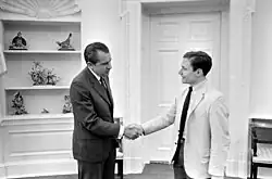 In the summer of 1970, Kristol was an intern at the White House.[15] In 1976, Kristol worked for Daniel Patrick Moynihan's United States Senate campaign, serving as deputy issues director during the Democratic primary. In 1988, he was the campaign manager for Alan Keyes's unsuccessful Maryland Senatorial campaign against Paul Sarbanes. After teaching political philosophy and U.S. politics at the University of Pennsylvania and Harvard's Kennedy School of Government, Kristol went to work in government in 1985, serving as chief of staff to United States secretary of education William Bennett during the Reagan administration, and later, as chief of staff to the vice president under Dan Quayle in the George H. W. Bush administration. The New Republic dubbed Kristol "Dan Quayle's brain" when he was appointed the vice president's chief of staff.