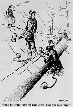 In 1959, Mauldin won a second Pulitzer Prize, while working at the St. Louis Post-Dispatch, for a cartoon depicting Soviet author Boris Pasternak in a Gulag, asking another prisoner, "I won the Nobel Prize for literature. What was your crime?"[12] Pasternak had won the Nobel Prize for his novel Doctor Zhivago, but was not allowed to travel to Sweden to accept it. The following year Mauldin won the National Cartoonist Society Award for Editorial Cartooning. In 1961, he received their Reuben Award as well.