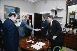 In March 1988, Weld resigned from the Justice Department, together with Deputy Attorney General Arnold Burns and four aides, in protest of improper conduct by Attorney General Edwin Meese.[18][19] In July 1988, Weld and Burns jointly testified before Congress in favor of a potential prosecution of Edwin Meese for his personal financial conduct, following a report by a special prosecutor investigating Edwin Meese.[19] Meese resigned from office in July 1988 shortly after Weld's and Burns's testimony.[19]