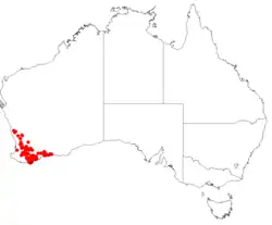 This species grows in woodland and mallee between Gillingarra and Esperance in the Avon Wheatbelt, Esperance Plains, Jarrah Forest, Geraldton Sandplains, Mallee, Swan Coastal Plain and Warren bioregions of south-western Western Australia.[2][3]
