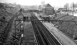 There was a goods yard on the 'down' (eastbound) side of the running lines to the north-west of the station, including a goods shed, cattle pens and a crane. There was a signal box on the 'up' side to the north-west of the station.[1] Goods traffic ceased on 15 June 1967 and the goods shed was demolished soon after.[1] The Shenfield to Southend Victoria line was originally electrified using 1.5 kV DC overhead line electrification (OLE) on 31 December 1956. This was changed to 6.25 kV AC in November 1960 and to 25 kV AC on 25 January 1979.[1]