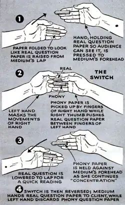 In his book The Physical Phenomena of Spiritualism, Hereward Carrington revealed the tricks of billet reading (with diagrams) that fraudulent mediums would use.[3] The psychical researcher Eric Dingwall observed Reese in New York and claimed to have discovered his cheating methods; according to Dingwall the exploits of Reese were "not worth any serious scientific consideration" and that Reese came into contact with the sealed notes.[4] Martin Gardner wrote that Reese was an expert mentalist no different from stage magicians of the period such as Joseph Dunninger but managed to fool a number of people into believing he was a genuine psychic.[5] Another magician to expose the methods of billet readers was Joseph Rinn.[6]