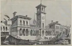 Bunning's building was soon found to be insufficient for the increased trade, and in 1872 the Corporation obtained an act of Parliament to rebuild and enlarge the market, which was done to plans by Bunning's successor as City architect Sir Horace Jones. The new site covered almost twice the area of the old, incorporating Billingsgate Stairs and Wharf and Darkhouse Lane. Work began in 1874, and the new market was opened by the Lord Mayor on 20 July 1877. The new buildings, Italianate in style, had on their long frontages towards Thames Street the river, a pedimented centre and continuous arcade, flanked at each end by a pavilion tavern. The general market, on a level with Thames Street, had an area of about 30,000 square feet (2,800 m2), and was covered with louvre glass roofs, 43 feet (13 m) high at the ridge. A gallery 30 feet (9.1 m) wide was allocated to the sale of dried fish, while the basement served as a market for shellfish.[3] Electric lighting was also furnished in November 1878 via 16 Jablochkoff Candles.[4]