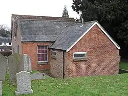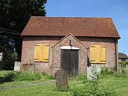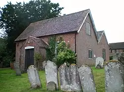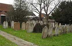 Worshippers from across northern Sussex came to this chapel; many were from the village of Billingshurst a few miles away.[4][6] This group later became large enough to split from the Horsham congregation and establish a chapel in their home village. They chose a grassy, raised site set back from the west side of the High Street,[7] and erected a modest cottage-like chapel in 1754.[note 1][7][8][9] The founders were William Turner and William Evershed, whose initials are recorded on a dated stone tablet inside.[10] Evershed was a General Baptist preacher at Horsham who moved to a farm in Billingshurst in 1742; together with Turner he held and preached at small meetings in Billingshurst.[6] The Evershed family maintained a 260 year connection with the chapel and more than 120 Eversheds of various generations, from William himself,[11] to Susie Evershed, who died in August 2022, aged 90,[12] are buried or commemorated in the graveyard,[13] a "surprisingly big" area which surrounds the chapel and helps it "make a display in spite of itself" and its modest architecture.[7] After making plans for a chapel in the village in 1753,[6] Turner and Evershed bought the site for three guineas (£600 as of 2023).[13][14] The chapel was registered for worship in October 1754;[6] its date of founding makes it one of the oldest Nonconformist places of worship in both the Horsham district and the whole of southeast England.[8][13]