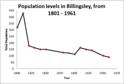According to the 2001 census Billingsley has a population of 181.[9] This consists of 69 households, containing 86 females and 95 males. In 1801, the population was around 320 and rose to just over 425 by 1811. The population then decreased rapidly between 1811 and 1821 to just below 180 people. The population slowly decreased again to just over 100 by 1901. It then increased to just below 180 again but then began to decrease slowly again until 1961 when it was just below 90 people.[10]