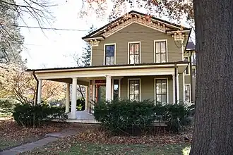 The Billingsley-Hills House, also known as the Veatch Residence, is a historic building located in Iowa City, Iowa, United States. This is one of several transitional Greek Revival to Italianate houses built in this area in the years before and after the American Civil War making it a very popular style here.[2] Over the years, however, most of them have either been torn down or altered beyond recognition leaving this house as one of few left with its integrity intact. When this house was built in 1870 it was situated on a 38-acre (15 ha) estate, but by the turn of the 20th century the lot was reduced to its present size. Situated in a residential area with the University of Iowa Hospitals and Clinics across the street, the two-story frame house features a low pitched gable roof, bracketed eaves, an entablature with dentils and returns, and a wrap-around front porch.