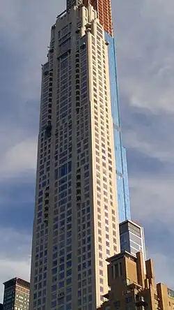The first supertall building to be built in the neighborhood was One57, a 1,004-foot (306 m) apartment building between Sixth and Seventh Avenues completed in 2014.[24] By then, several other even-taller skyscrapers were proposed or under construction along the stretch of 57th Street roughly corresponding to the southern edge of Central Park.[25] Due to the often record-breaking prices[26][27] that have been set for the apartments in these buildings, the press dubbed this section of 57th Street "Billionaires' Row".[28][29][30][31] The term has since been extended to other supertall luxury buildings facing southern Central Park not strictly on 57th Street.[32]