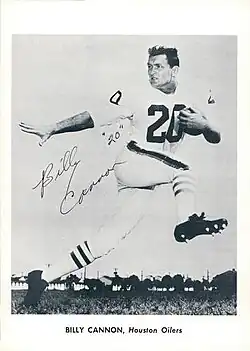 Cannon joined the newly formed Oilers under head coach Lou Rymkus.[57] As one of the highest-paid players in professional football, he was heckled early on by opposing players.[58] Nor did he get along well with Rymkus, whom he described as "unpleasant, confrontational, with a nasty disposition and an oversized ego."[59] In Cannon's rookie year, he led the team in rushing with 644 yards and caught five touchdown passes.[60] His 88-yard touchdown reception from quarterback George Blanda in the 1960 AFL Championship Game helped the Oilers become the inaugural AFL champions. For his efforts, Cannon was named the game's most valuable player.[61]
