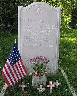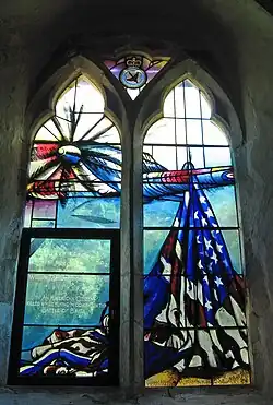 Fiske is buried in St Mary and St Blaise churchyard in Boxgrove, Sussex.[23] The inscription on his gravestone reads simply: He died for England.[24] The funeral was publicized for propaganda purposes.[25] A memorial stained glass window was dedicated to him on 17 September 2008 at Boxgrove Priory.[26] At the dedication service, a number of former colleagues attended and his green Bentley car was on display.[27] Fiske is listed on the Battle of Britain Monument in London and the Battle of Britain Memorial, Capel-le-Ferne.