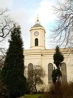 Christian worship in Bilston can be traced back to 1090. In 1458, the chapel was replaced by St Leonard's Chantry and a third renovated church was consecrated in 1733. The church seen today dates from a rebuilding of 1825–26 to the designs of Francis Godwin in the manner of John Soane and is the fourth church on the site, though a small amount of older stonework from the C14 or C15 remains visible inside the present tower.[14] It was altered in 1882–83 by prolific church architect Ewan Christian.[15] Ewan Christian altered the aisle windows into single tall, thin openings where there had previously been two. The church contains a font of 1673, probably from the older church.[16] The church is painted stucco inside and out. It is also unusual in having a chamfered square tower, giving it an octagonal appearance, in being surmounted with a cupola, a golden globe with weather vane and a fenced viewing platform.