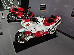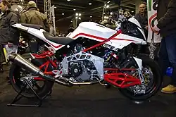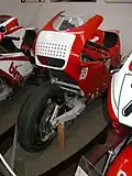 The first prototype was presented at the Milan Motorcycle Show in 1983. At that time, it was powered by a Honda VF 400 F engine, and its frame was a carbon fiber monocoque positioned under the engine.[8] The bike had a futuristic design[9] and introduced a hydraulic steering system known as DCS (Dive Control System). This system used two pistons: one on the left side of the wheel and another under the handlebars. When the rider turned the handlebars right, the second piston pushed hydraulic fluid through a hose, compressing the wheel piston. When turning left, the fluid was directed into a second hose, causing the wheel piston to extend.[10]