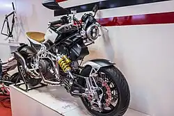 Suspension is handled by Öhlins, with two shock absorbers providing 100 mm of travel at the front and 130 mm at the rear.[56] Unlike the Tesi 3D, the swingarms are no longer made of tubular trellis but cast aluminum.
