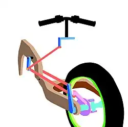 The front and rear swingarms are connected by an omega-shaped frame. The wheel hub houses two tapered bearings and an axle, which is connected via a linkage system to a small steering column located against the frame on the left side of the bike. Another linkage connects this column to the lower triple clamp and clip-on handlebars.[5]