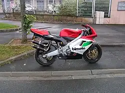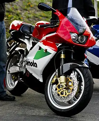 The V Due was a 500cc V-twin two-stroke motorcycle first manufactured by Bimota in 1997. Technical specs included the first electronically controlled direct fuel injection on a two-stroke bike, cassette type gearbox and dry clutch. Its power-to-weight ratio surpassed almost all sports bikes of the day. The first production run of 150 bikes suffered from major problems including oil leaks, seized pistons and intermittent power delivery. Many new owners simply returned their bikes at this point. In 1999 Bimota managed to fix most of the initial faults and made 26 units, all however were not road legal. In 2001 Bimota gave up with its problematic electronic fuel injection and fitted carburetors, first producing the non-road legal "Evoluzione Corsa" model of which only 14 were produced and finally the road legal "Evoluzione" model of which 120 were produced and sold. Today, due to its rarity, most V Dues are in the hand of collectors.