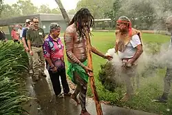 ![]() Smoking ceremony led by Bindal elders at Australian Institute of Marine Science, Cape Cleveland, 21 March 2018 | |