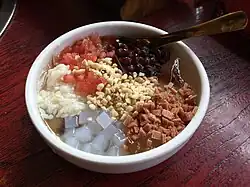 Bingfen (Chinese: 冰粉; pinyin: bīngfěn), also called ice jelly, is a Chinese dessert native to Southwest China in provinces such as Sichuan, Guizhou, and Yunnan. It is served as a bowl of iced transparent jelly, made from the seeds of the Nicandra physalodes plant, along with toppings like haw flakes and wolfberries.[1][2] It is commonly sold in the summertime as a street food.[1][3]
